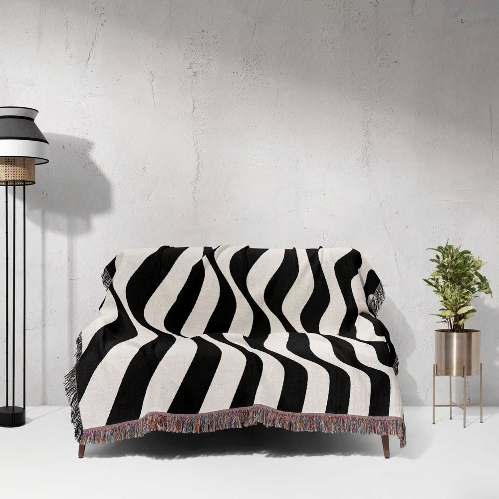 Redefine the focal point of your interior with the fluid, rhythmic motion of the accent abstract waves woven blanket throw tapestry. This piece features a sophisticated wiggle pattern - a series of undulating, hand-drawn lines that mimic the organic flow of water or the shifting contours of a landscape. The high-contrast, monochromatic palette ensures that the accent abstract waves woven blanket throw tapestry provides a sharp, designer edge to your home, making it the ultimate accessory for a minimalist lounge or a contemporary bedroom retreat.
