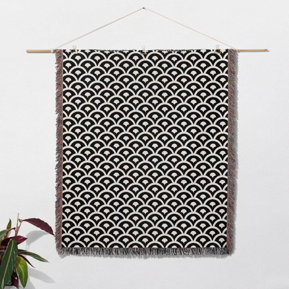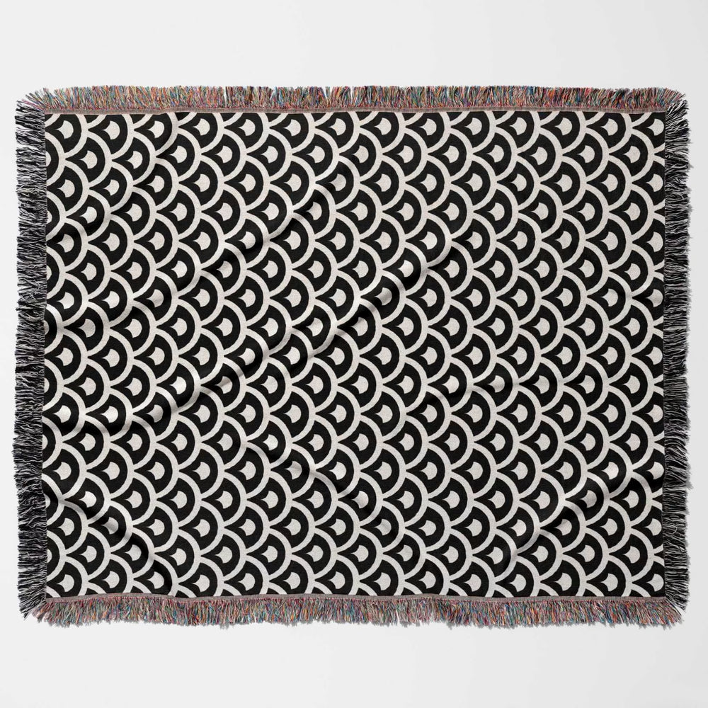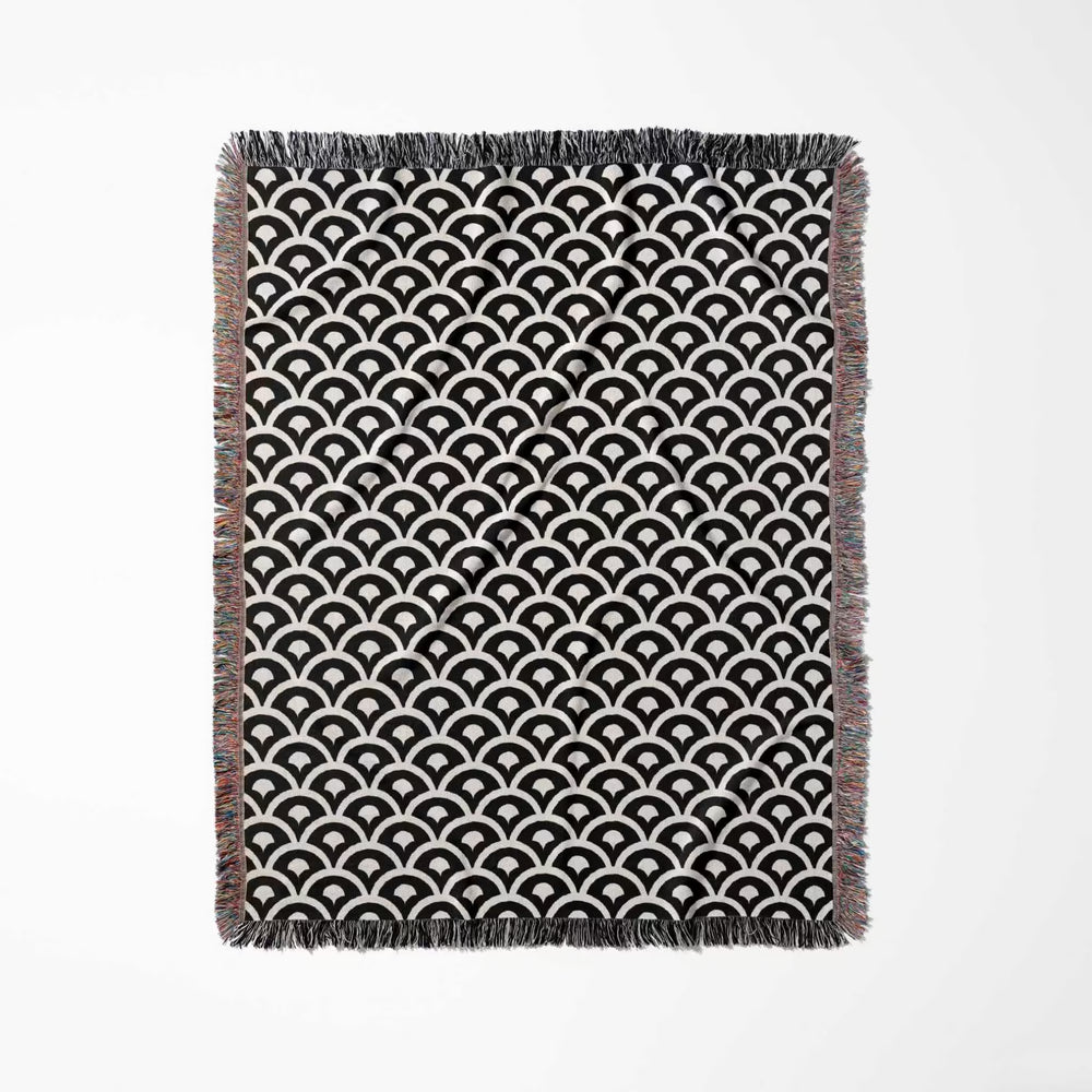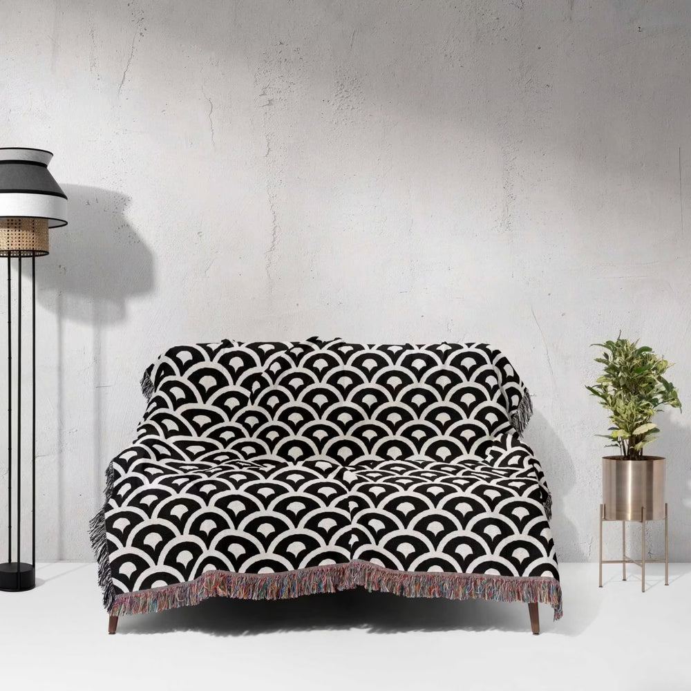 Infuse your home with the timeless harmony of Eastern design with this asian geometric pattern woven blanket. Drawing inspiration from traditional architectural motifs and interlocking lattice-work, this statement piece features a mesmerizing rhythmic pattern in a high-contrast palette of deep obsidian and crisp off-white. It is the perfect sophisticated accent for a minimalist living room, providing a structured yet organic touch to your decor.