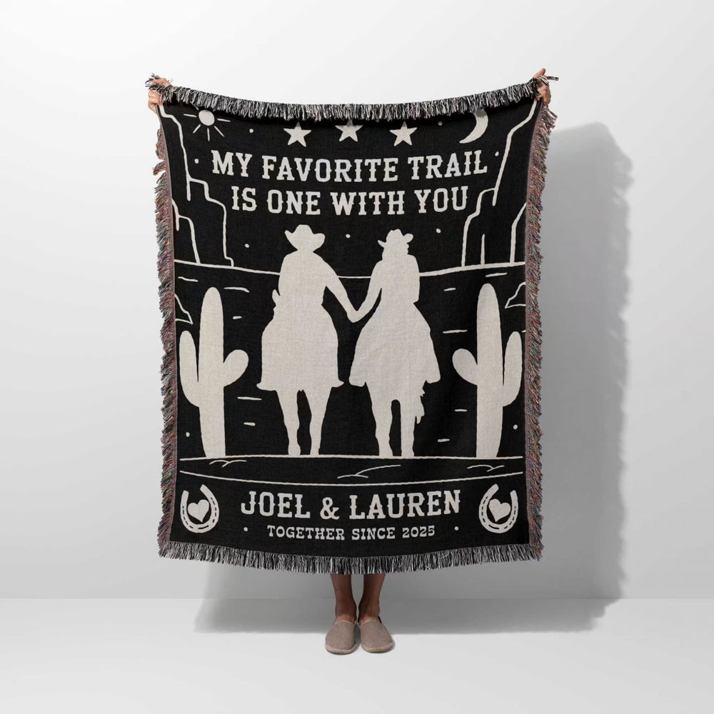 Wrap your love story in western romance with the cowboy and cowgirl on two horses 2nd anniversary woven throw blanket - a lasting keepsake that celebrates connection, adventure, and love woven into every thread.
