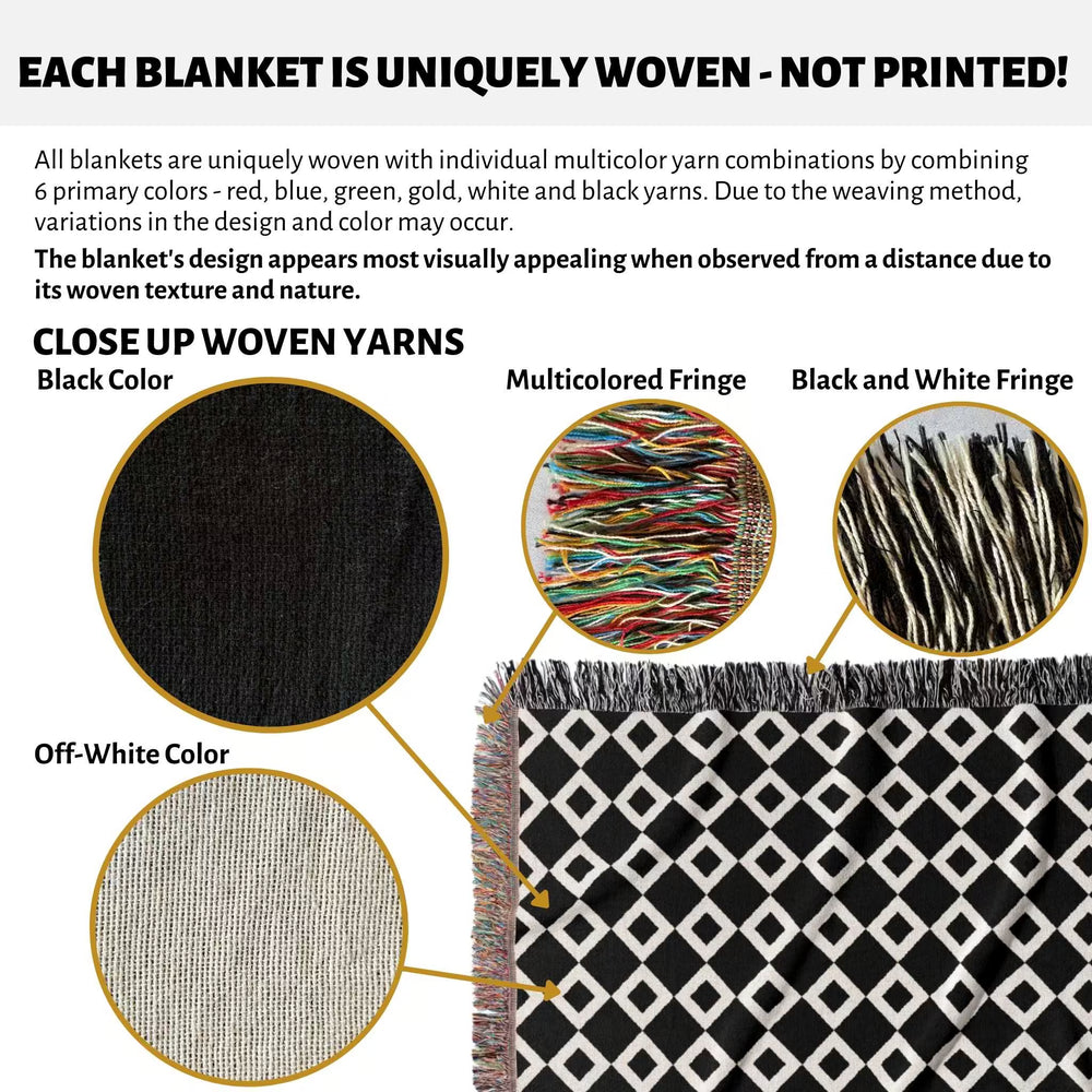 This soft blanket is made by a woven technique using raw thread and not by printing techniques making each blanket unique. When looked at very closely, the blanket colors are made by combining primary solid-colored black, white, red, blue, green, and gold yarns to create desired colors. The white color runs more on the beige scale due to the yarn's natural color. The blanket fringe is multicolored on two sides and the remaining two sides are black and white.