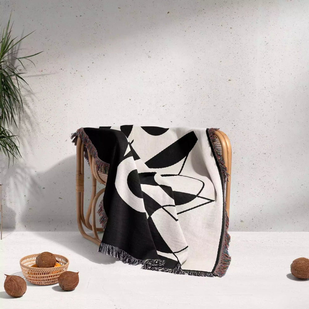 Experience the timeless beauty of geometric art with this black and white woven throw blanket. This unique and modern abstract art woven blanket showcases a captivating interplay of intricate design and bold contrasts. Crafted with meticulous attention to detail, this blanket is both a functional and artistic piece. Made from 100% cotton, it provides a soft and cozy feel, perfect for snuggling up on the couch or adding an artistic touch to your living space. The black and white color scheme adds a touch of elegance and versatility, making it an ideal complement to any home decor style. Whether you use it as a throw blanket or a decorative tapestry, this woven masterpiece will enhance your surroundings with its artistic charm. Elevate your home decor with this black and white geometric art woven throw blanket, a statement piece that brings sophistication and style to any room.