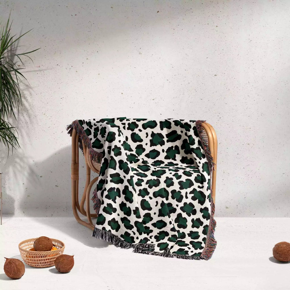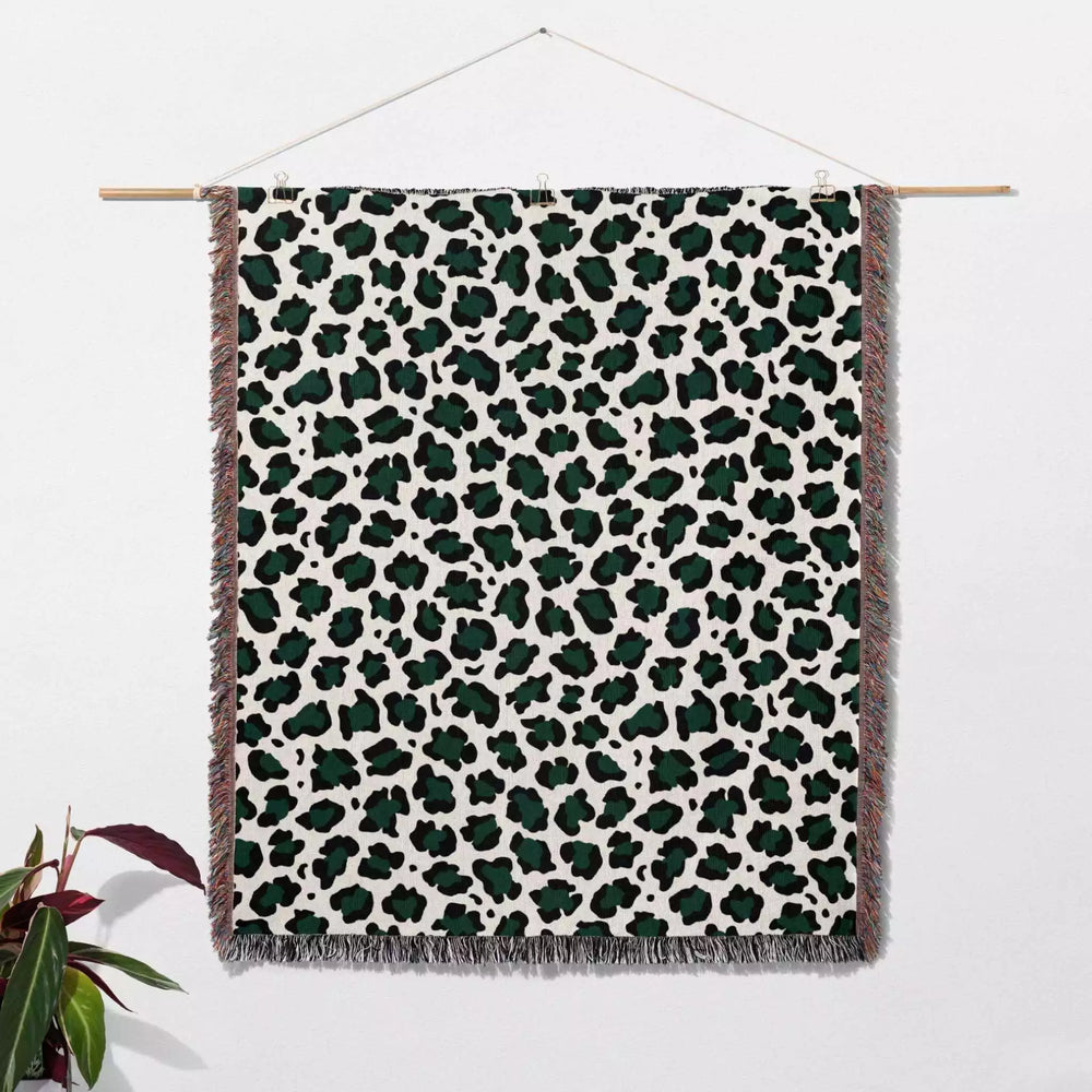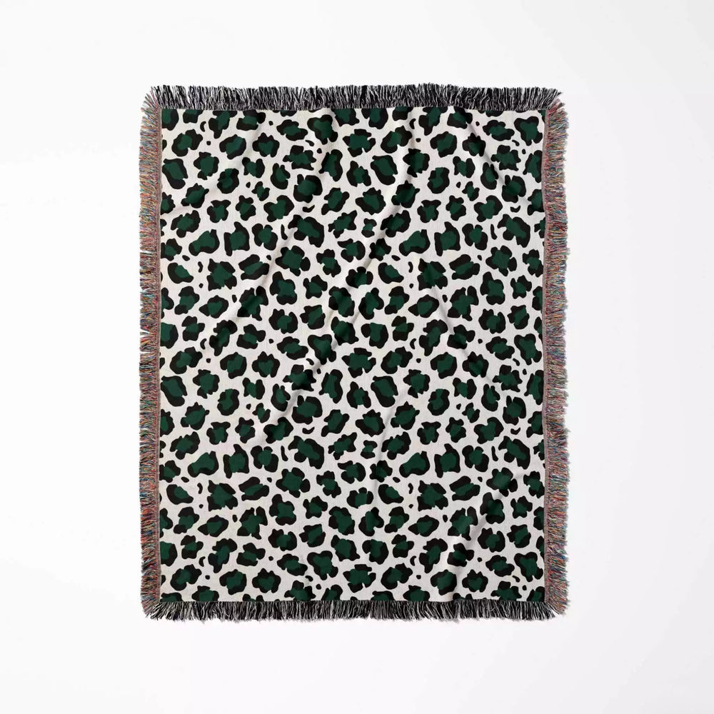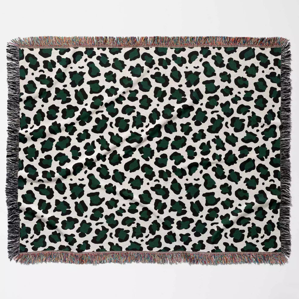 Leopard Print Black and Forest Green Woven Throw Blanket and Tapestry