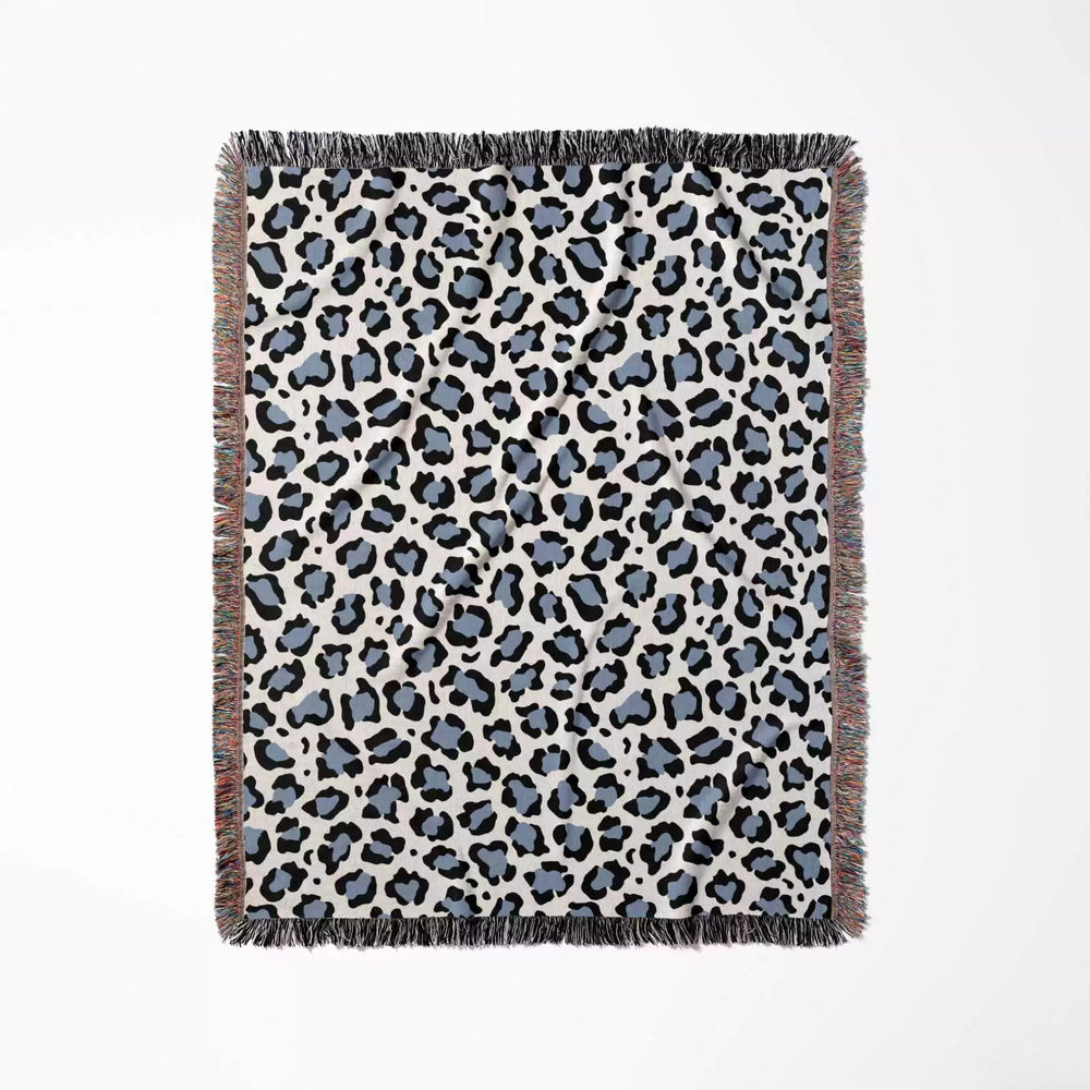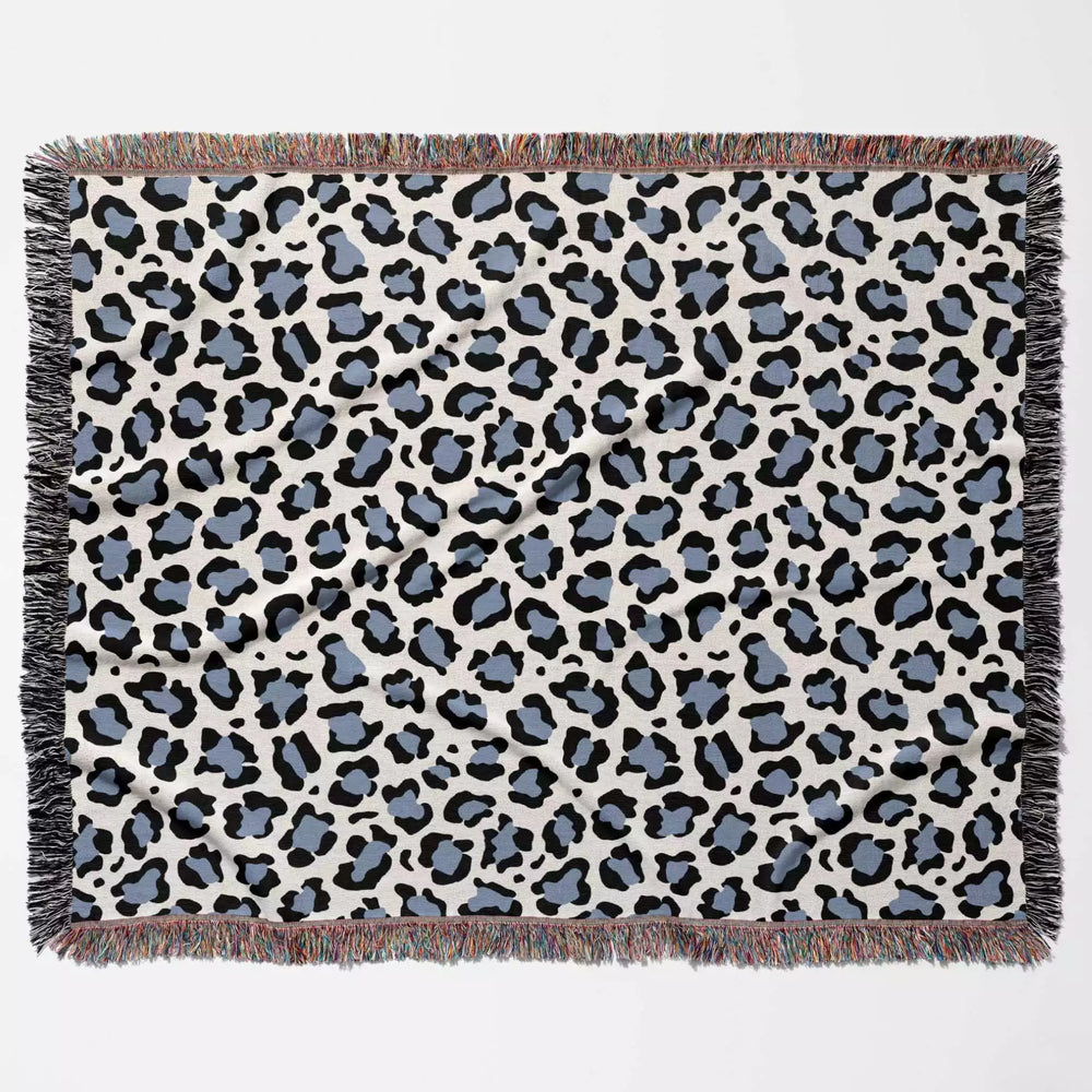 Leopard Print Black and Light Blue Woven Throw Blanket and Tapestry